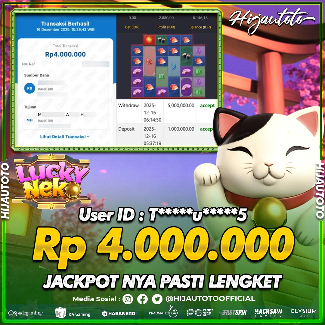 Selamat Kepada Member HIJAUTOTO T***********5 Telah Jackpot Di SLOT LUCKY NEKO