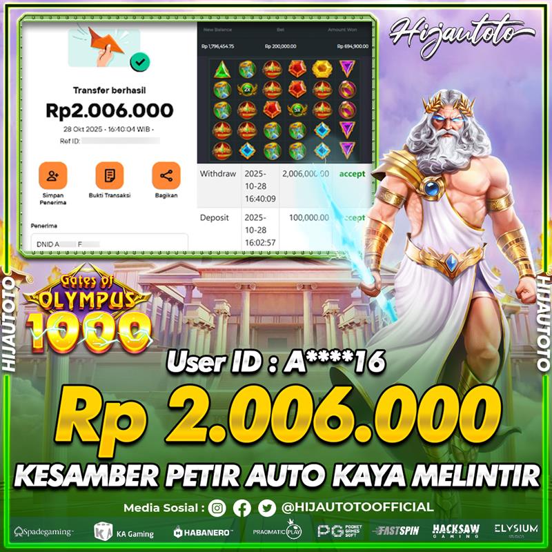 Selamat Kepada Member HIJAUTOTO A*****6 Telah Jackpot Di SLOT GATES OF OLYMPUS 1000
