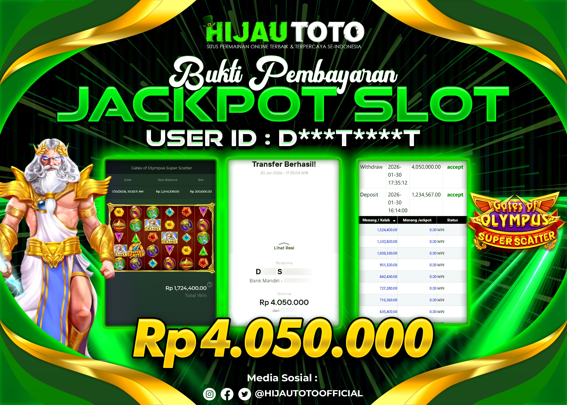 Selamat Kepada Member HIJAUTOTO D********T Telah Jackpot Di SLOT GATES OF OLYMPUS SUPER SCATTER