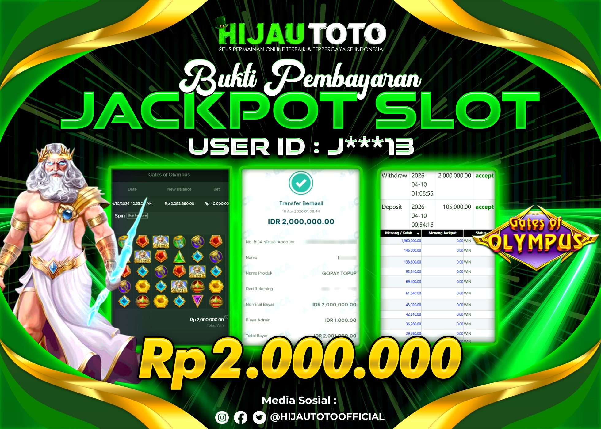 Selamat datang di HIJAUTOTO, tempatnya seru-seruan dan cuan besar! Mulai main cukup dengan modal Rp5.000 aja, taruhan super murah dari Rp100 perak! Mau main slot yang penuh warna? Atau togel dari 20 pasaran paling hits? Atau mungkin tembak ikan yang bikin deg-degan? Tenang, ada juga taruhan bola, sabung ayam, dan live casino yang bikin suasana makin hidup! Daftar sekarang dan dapetin bonus new member 100% langsung, biar modalmu makin tebal. Deposit gampang banget, bisa pakai QRIS, dan kalau butuh bantuan, customer service kita siap 24 jam nonstop. Jadi, tunggu apa lagi? Yuk, gabung dan bawa pulang kemenangannya cuma di HIJAUTOTO!