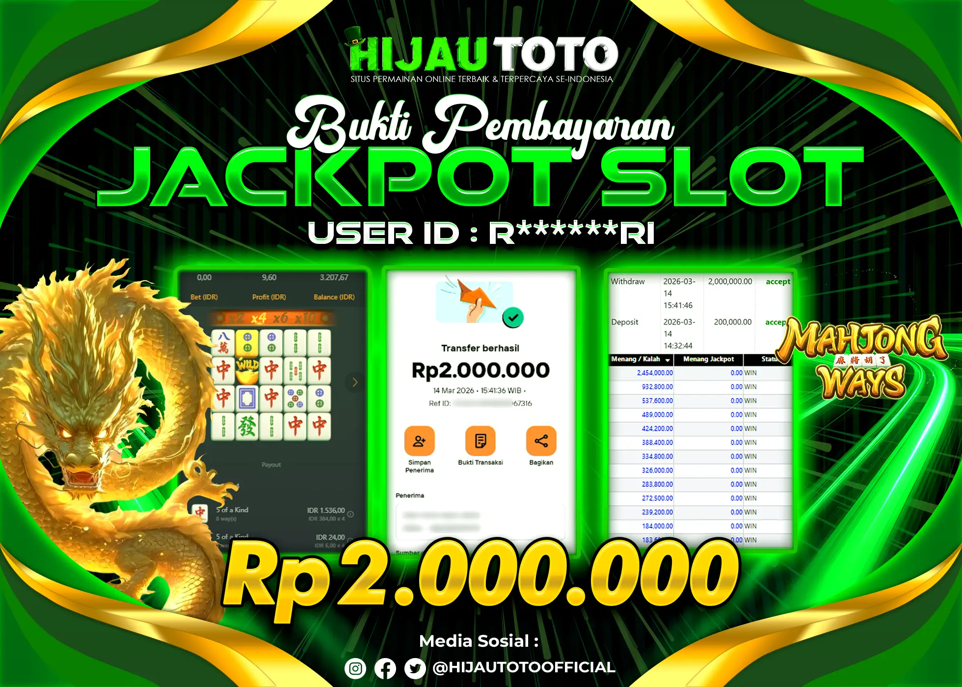 Bergabung dengan HIJAUTOTO sangat mudah dan cepat. Cukup lakukan pendaftaran dengan data lengkap, lakukan deposit minimal Rp5.000 melalui berbagai metode termasuk QRIS, dan mulai bertaruh dengan minimal taruhan Rp100. Dapatkan juga bonus new member 100% untuk modal bermain lebih besar.