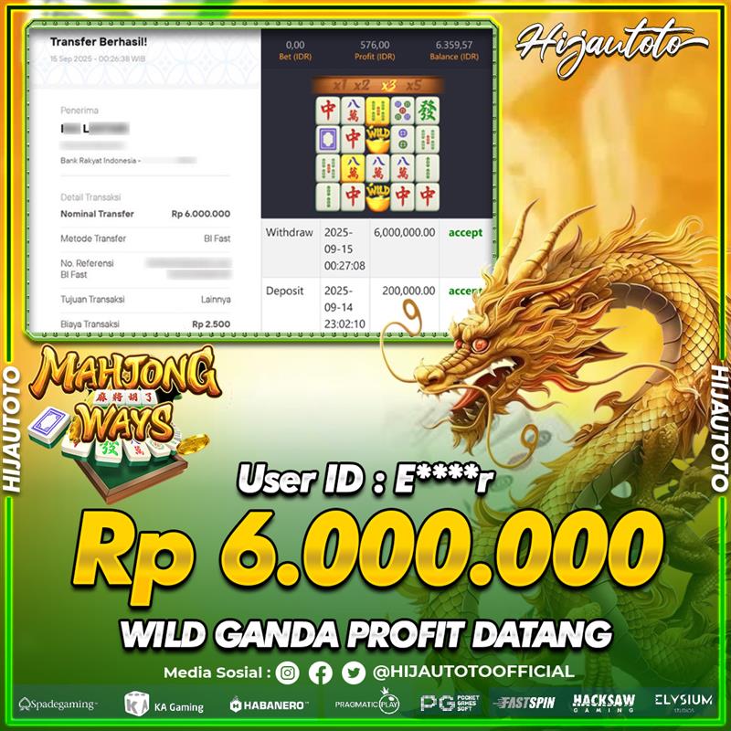 Selamat Kepada Member HIJAUTOTO E****R Telah Jackpot Di SLOT MAHJONG WAYS