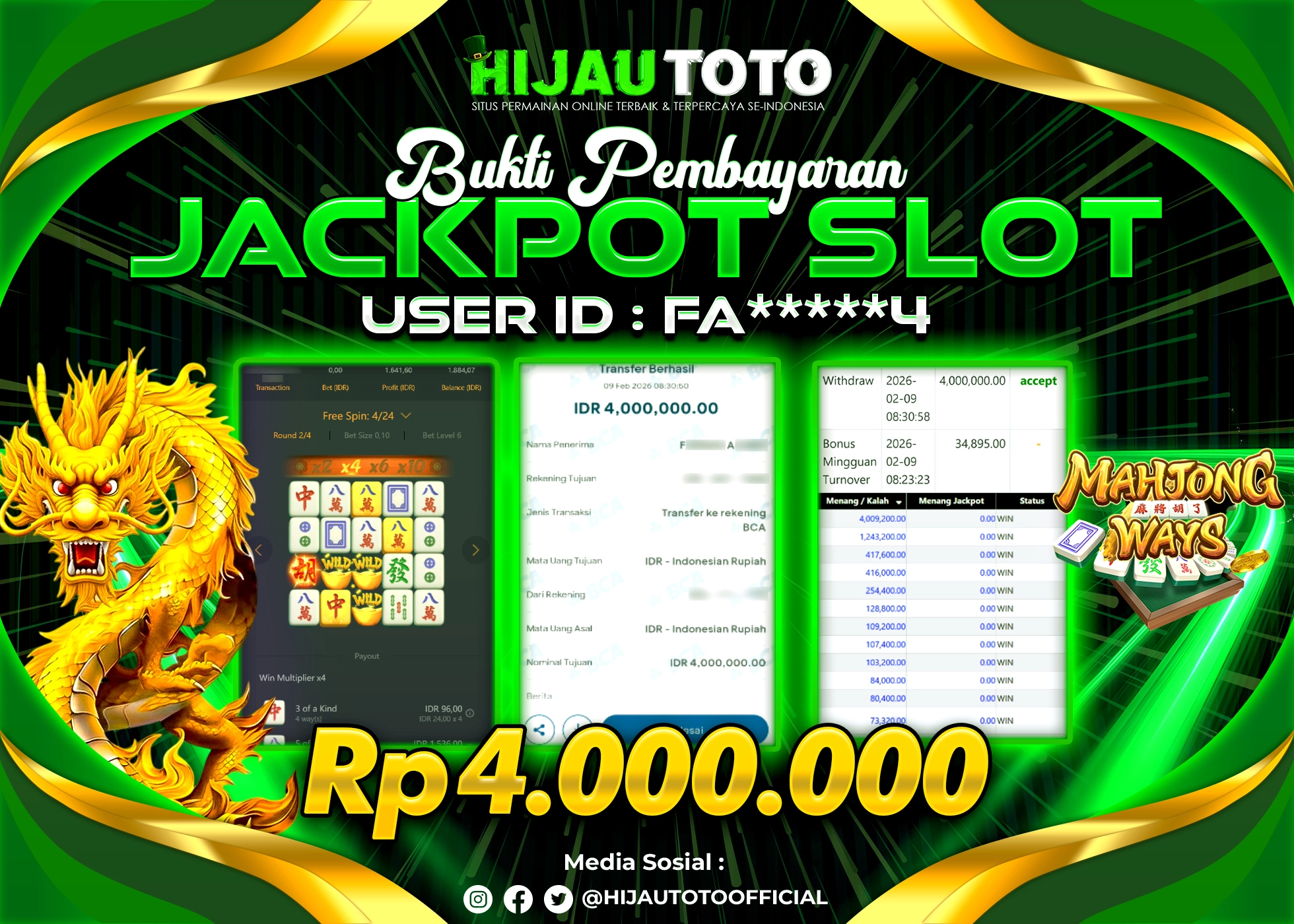 Bergabung dengan HIJAUTOTO sangat mudah dan cepat. Cukup lakukan pendaftaran dengan data lengkap, lakukan deposit minimal Rp5.000 melalui berbagai metode termasuk QRIS, dan mulai bertaruh dengan minimal taruhan Rp100. Dapatkan juga bonus new member 100% untuk modal bermain lebih besar.