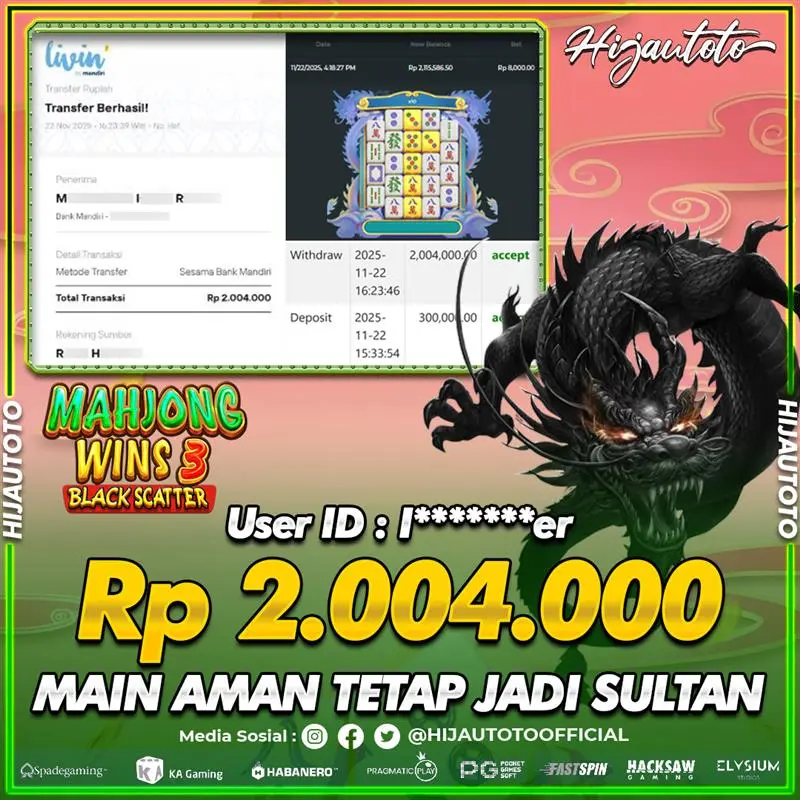 Selamat Kepada Member HIJAUTOTO I*******ER Telah Jackpot Di SLOT MAHJONG WINS 3 BLACK SCATTER