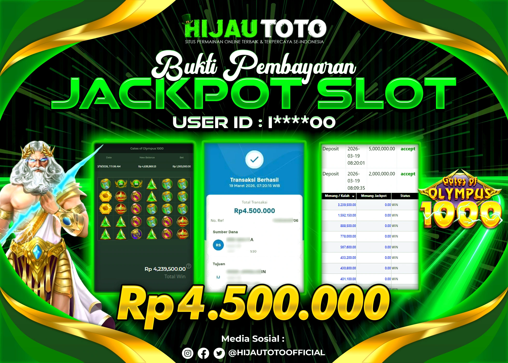 Selamat Kepada Member HIJAUTOTO I*****0 Telah Jackpot Di SLOT GATES OF OLYMPUS 1000