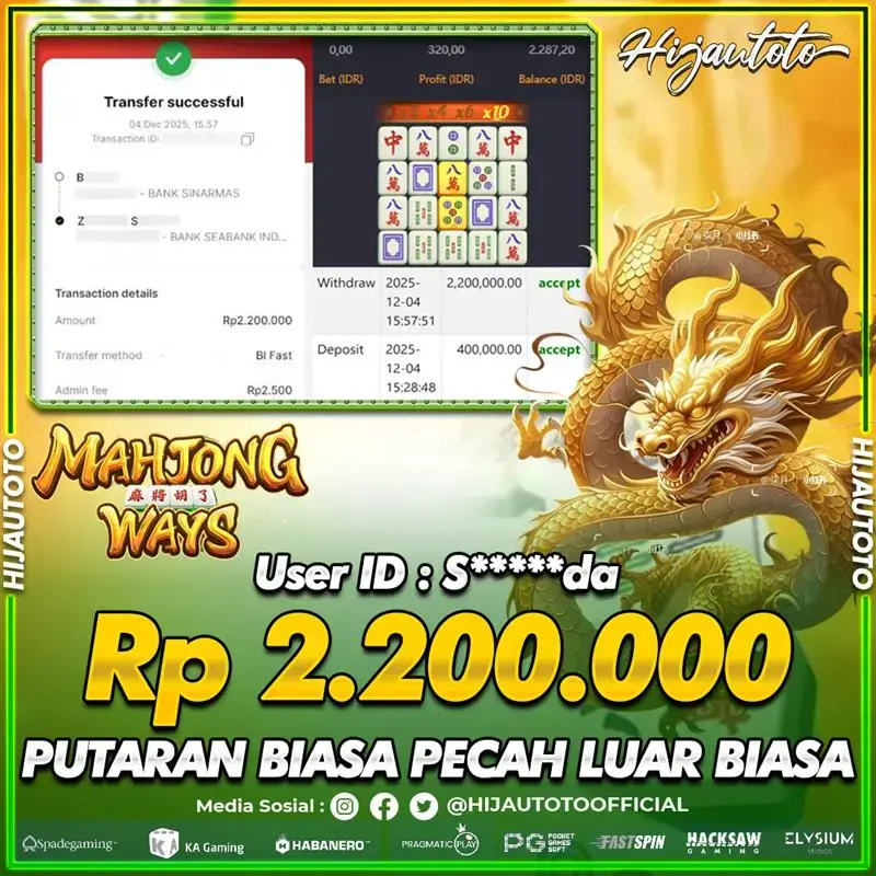 Selamat Kepada Member HIJAUTOTO S*****DA Telah Jackpot Di SLOT MAHJONG WAYS