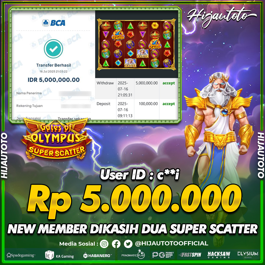 Selamat Kepada Member HIJAUTOTO C*** Telah Jackpot Di SLOT GATES OF OLYMPUS SUPER SCATTER