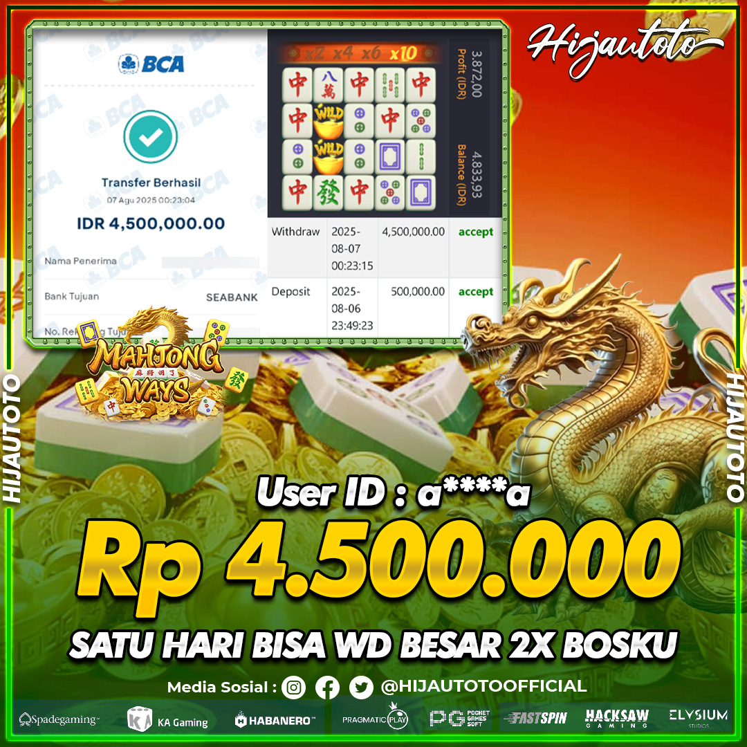Selamat Kepada Member HIJAUTOTO A**** Telah Jackpot Di SLOT MAHJONG WAYS