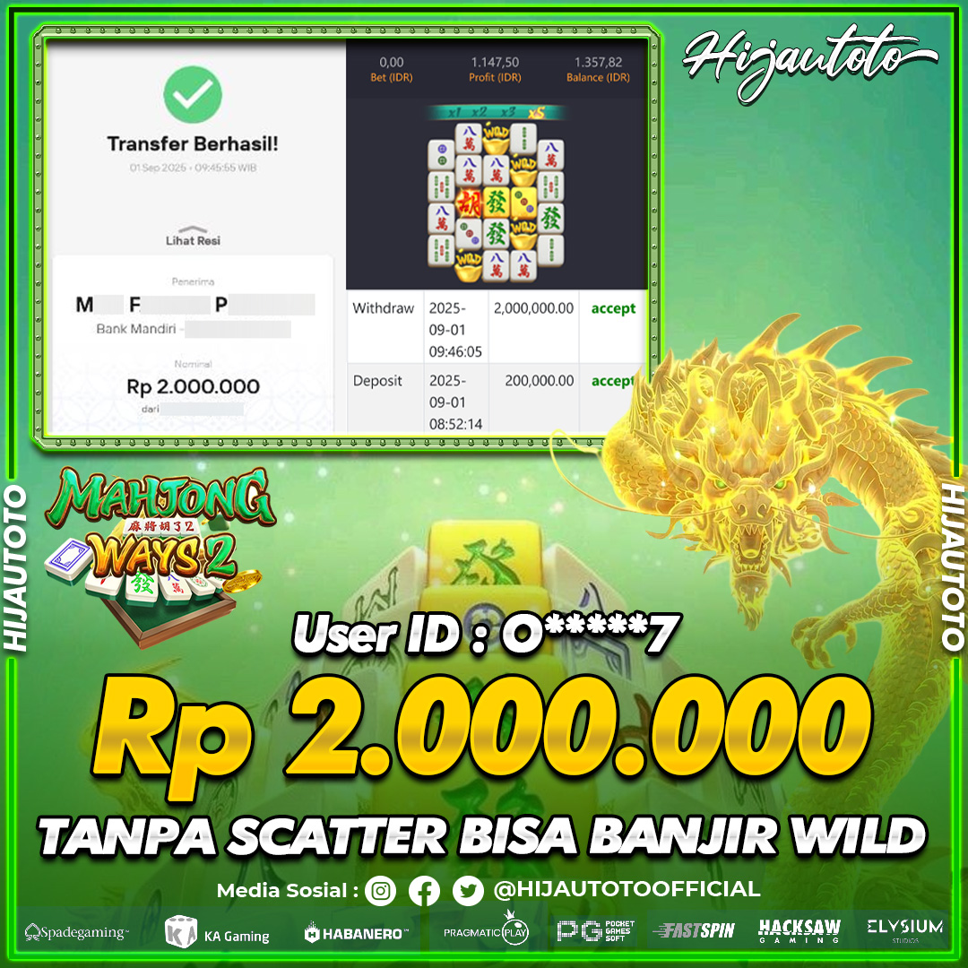 Selamat Kepada Member HIJAUTOTO O******7 Telah Jackpot Di SLOT MAHJONG WAYS 2
