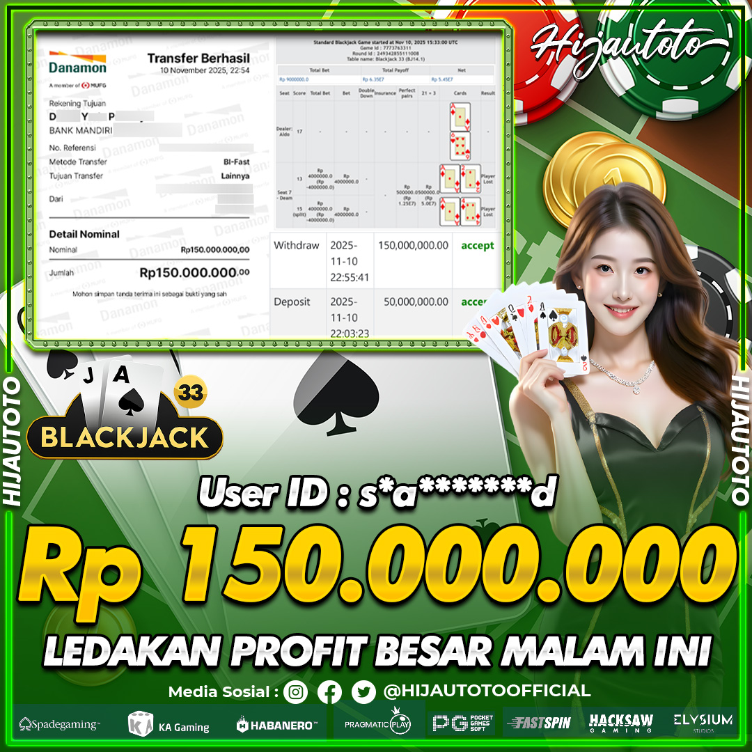 Selamat Kepada Member HIJAUTOTO S*A*******D Telah Jackpot Di LIVE CASINO BLACKJACK