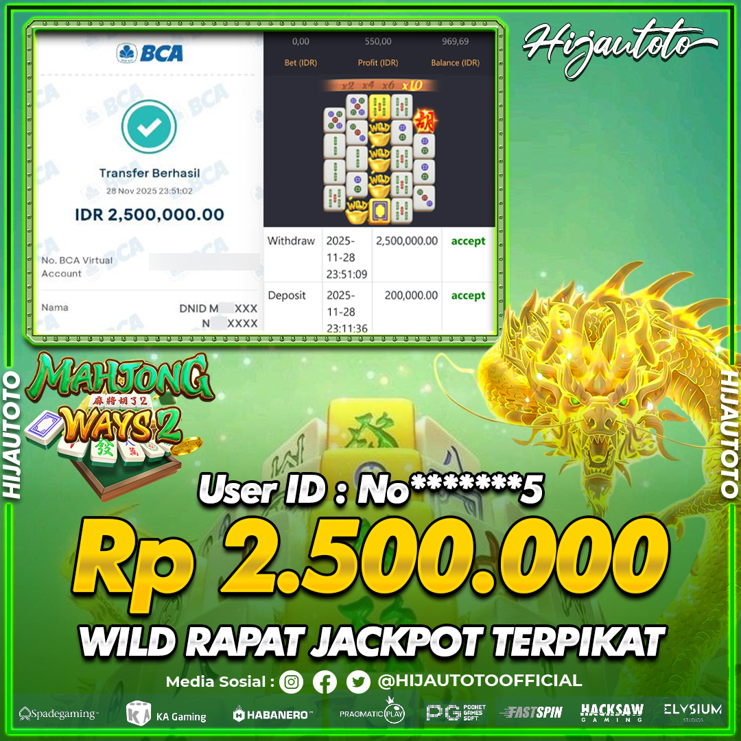 Selamat Kepada Member HIJAUTOTO NO*******5 Telah Jackpot Di SLOT MAHJONG WAYS 2