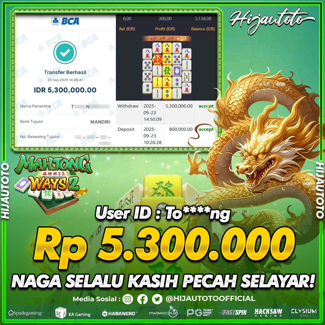 Selamat Kepada Member HIJAUTOTO TO****NG Telah Jackpot Di SLOT MAHJONG WAYS 2