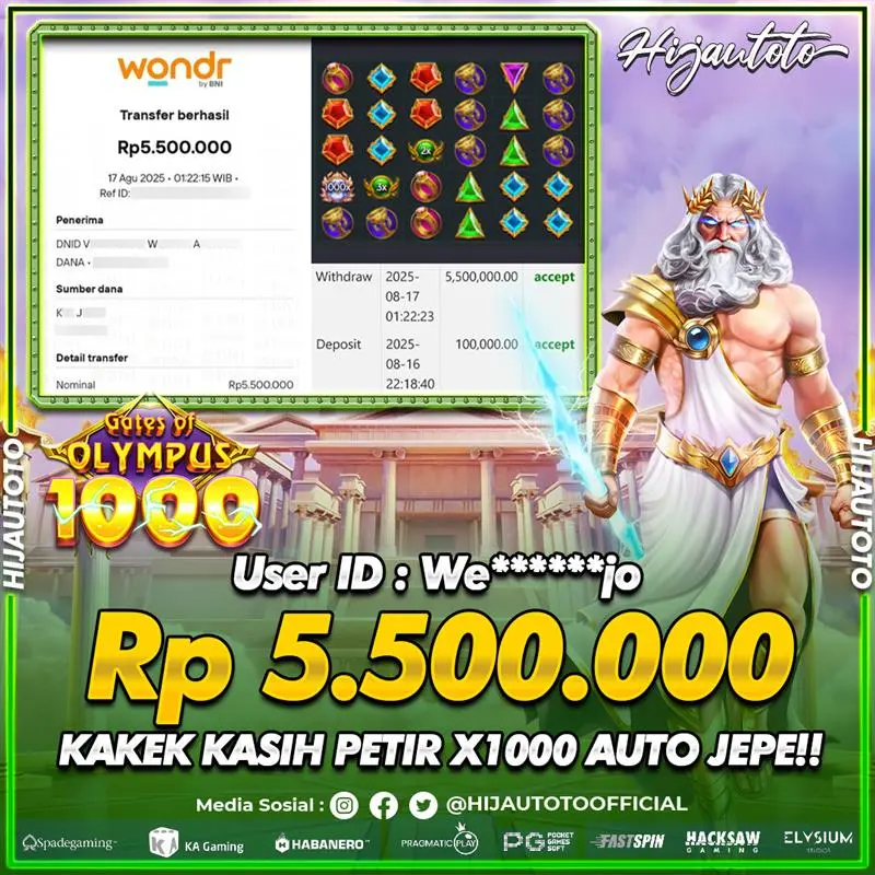 Selamat Kepada Member HIJAUTOTO WE*****JO Telah Jackpot Di SLOT GATES OF OLYMPUS 1000