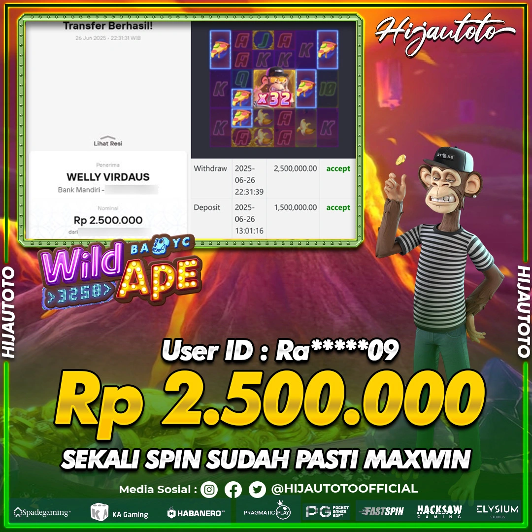 Selamat Kepada Member HIJAUTOTO RA*****09 Telah Jackpot Di SLOT WILD APE