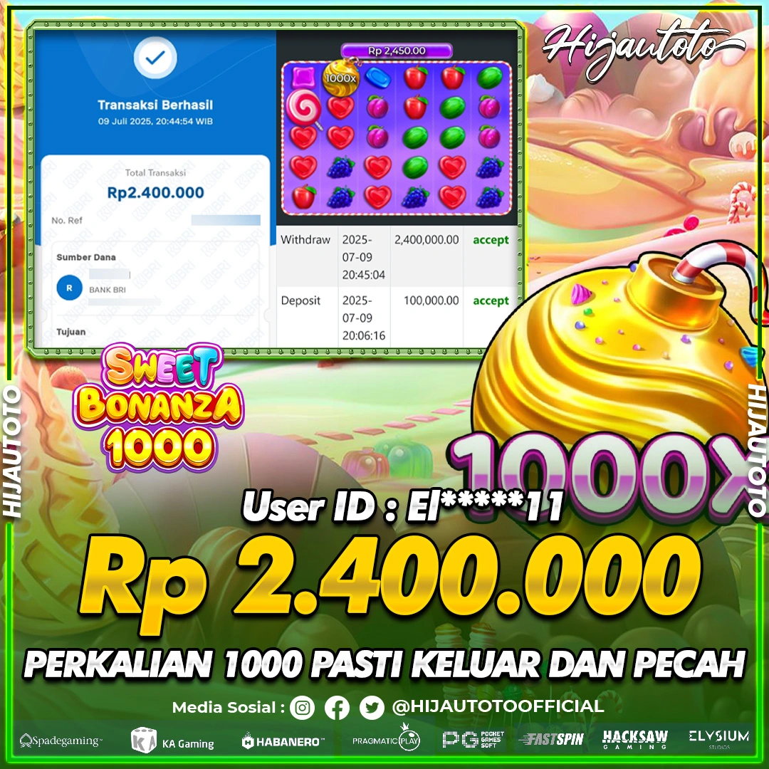 Selamat Kepada Member HIJAUTOTO EL*****11 Telah Jackpot Di SLOT SWEET BONANZA 1000