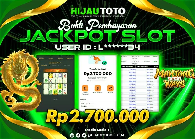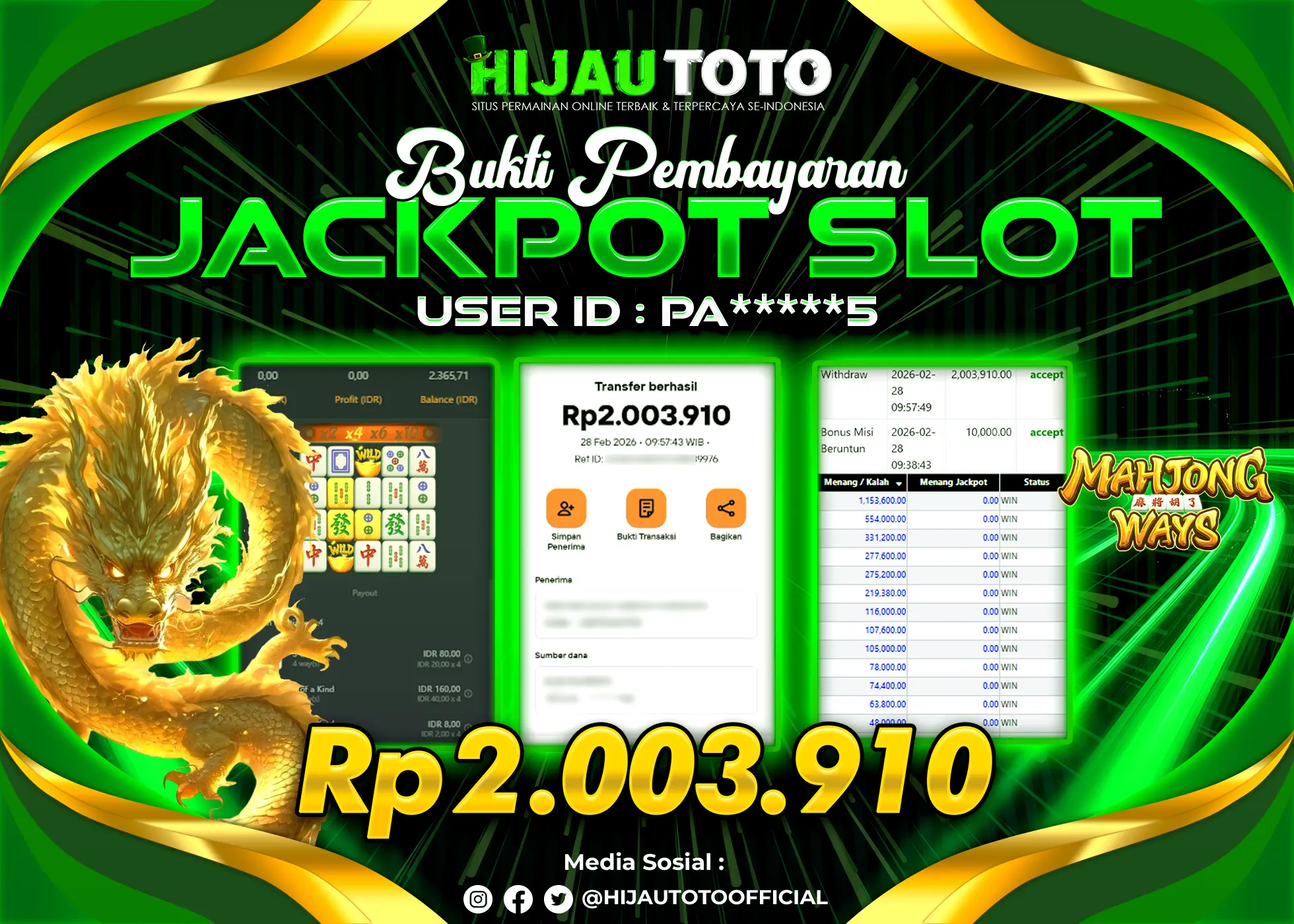 Selamat Kepada Member HIJAUTOTO C******99 Telah Jackpot Di SLOT MAHJONG WAYS