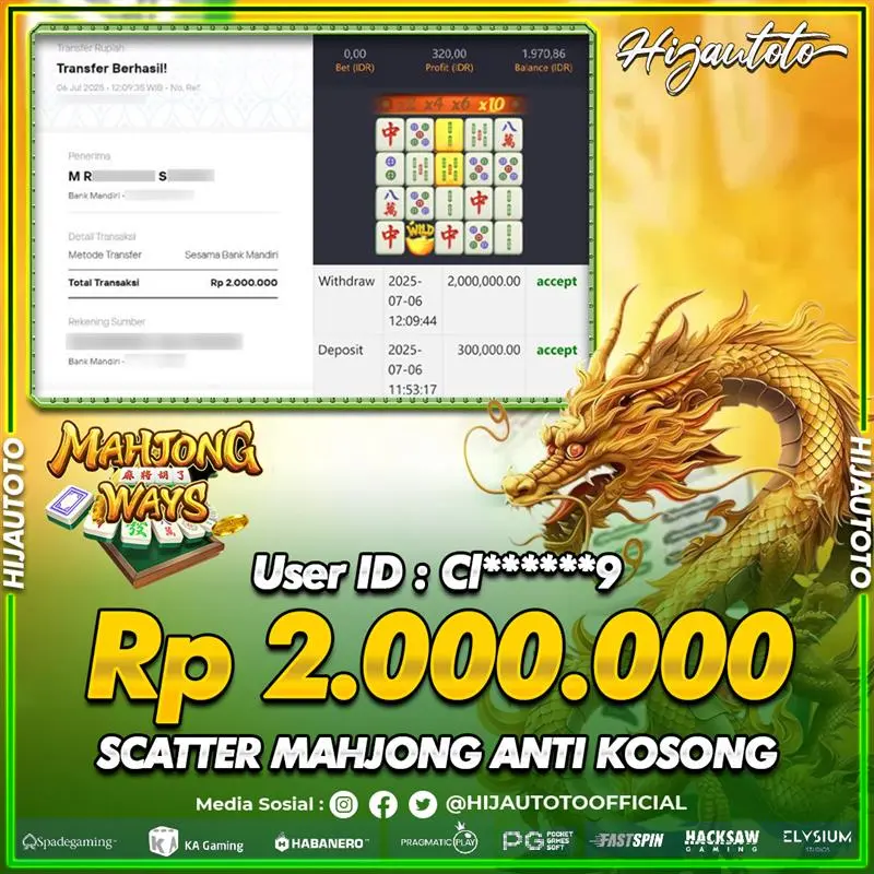 Selamat Kepada Member HIJAUTOTO CI******9 Telah Jackpot Di SLOT MAHJONG WAYS