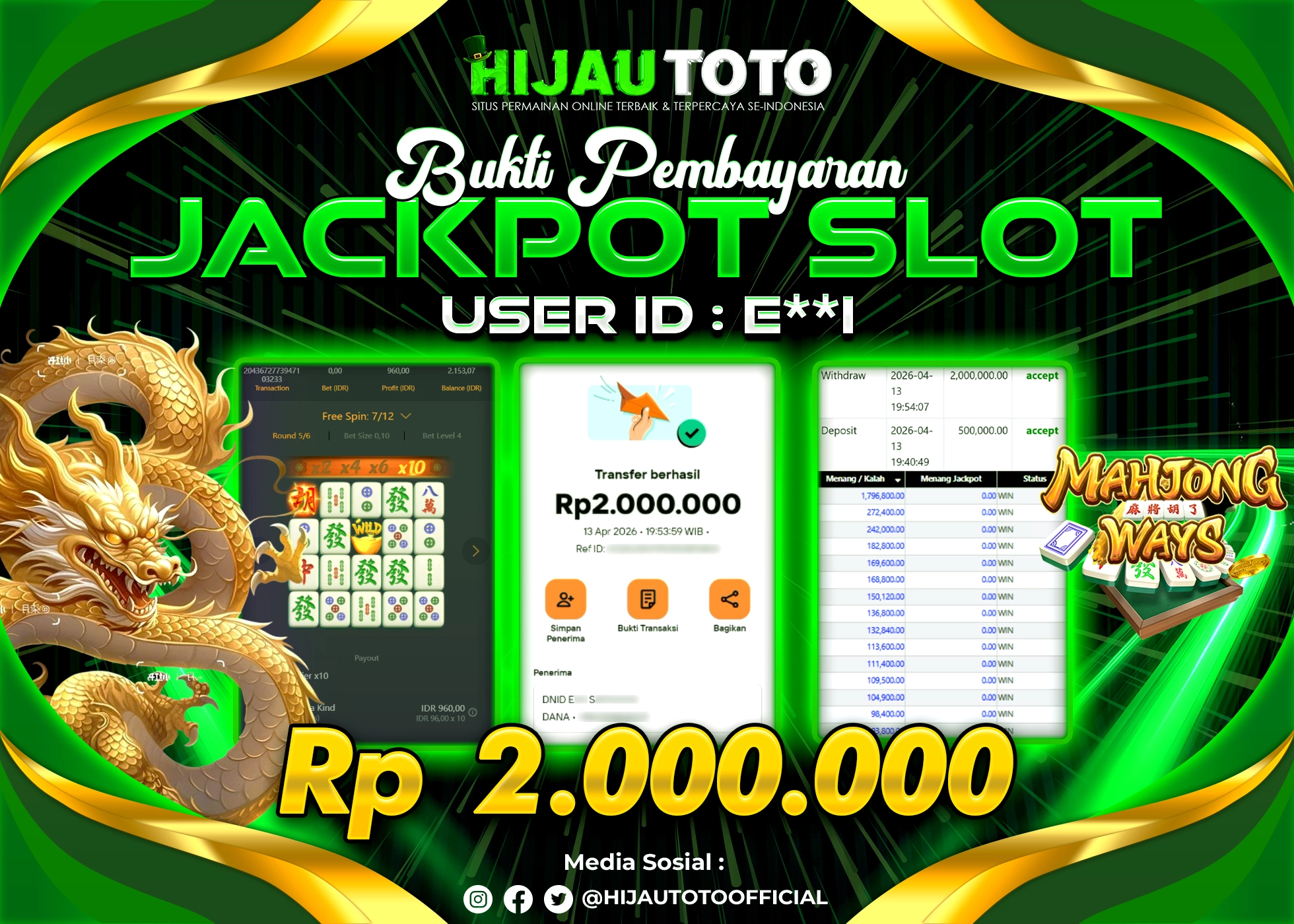 Bergabung dengan HIJAUTOTO sangat mudah dan cepat. Cukup lakukan pendaftaran dengan data lengkap, lakukan deposit minimal Rp5.000 melalui berbagai metode termasuk QRIS, dan mulai bertaruh dengan minimal taruhan Rp100. Dapatkan juga bonus new member 100% untuk modal bermain lebih besar.