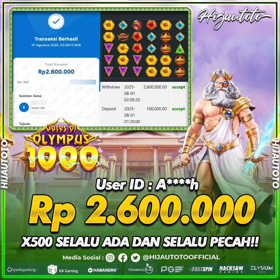 Selamat Kepada Member HIJAUTOTO A****H Telah Jackpot Di SLOT GATES OF OLYMPUS 1000