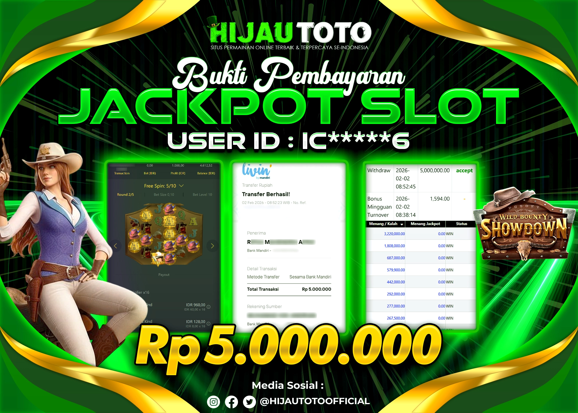 Selamat Kepada Member HIJAUTOTO IC*****6 Telah Jackpot Di SLOT WILD BOUNTY SHOWDOWN
