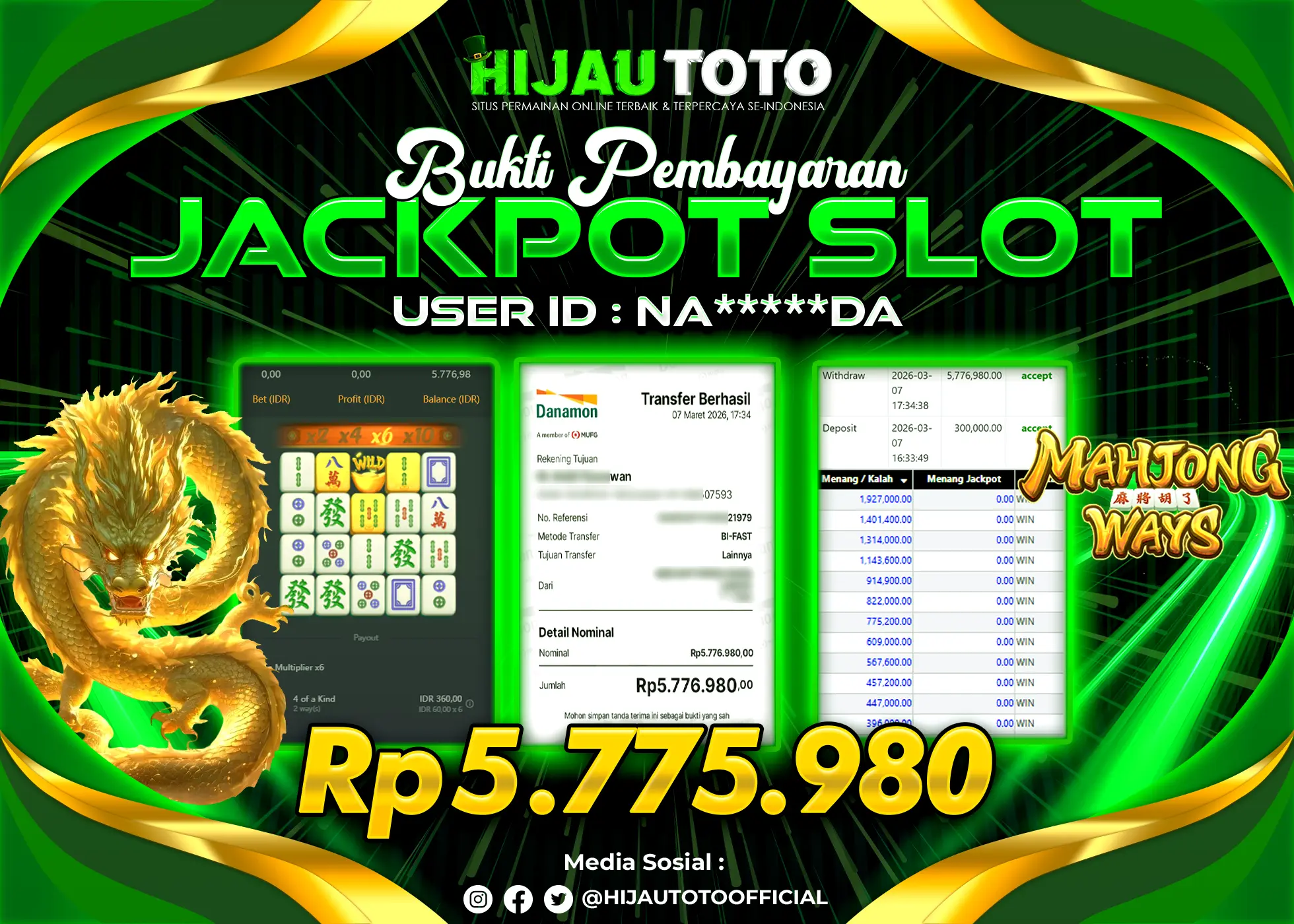 Selamat datang di HIJAUTOTO, tempatnya seru-seruan dan cuan besar! Mulai main cukup dengan modal Rp5.000 aja, taruhan super murah dari Rp100 perak! Mau main slot yang penuh warna? Atau togel dari 20 pasaran paling hits? Atau mungkin tembak ikan yang bikin deg-degan? Tenang, ada juga taruhan bola, sabung ayam, dan live casino yang bikin suasana makin hidup! Daftar sekarang dan dapetin bonus new member 100% langsung, biar modalmu makin tebal. Deposit gampang banget, bisa pakai QRIS, dan kalau butuh bantuan, customer service kita siap 24 jam nonstop. Jadi, tunggu apa lagi? Yuk, gabung dan bawa pulang kemenangannya cuma di HIJAUTOTO!