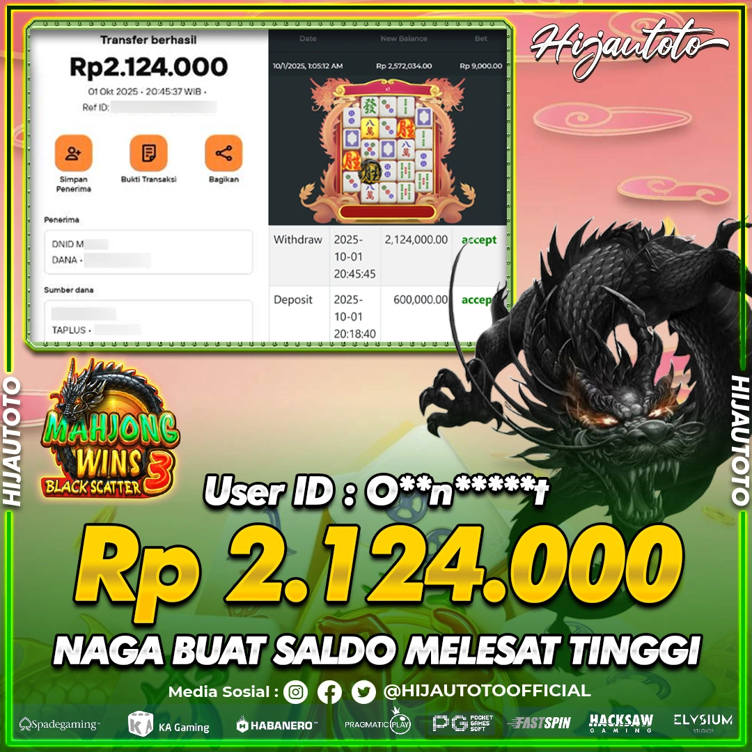 Selamat Kepada Member HIJAUTOTO O**N*****T Telah Jackpot Di SLOT MAHJONG WINS 3 BLACK SCATTER