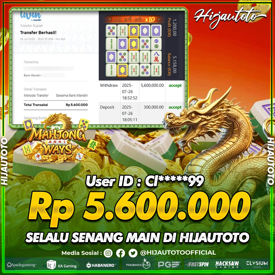 Selamat Kepada Member HIJAUTOTO CL*****99 Telah Jackpot Di SLOT MAHJONG WAYS