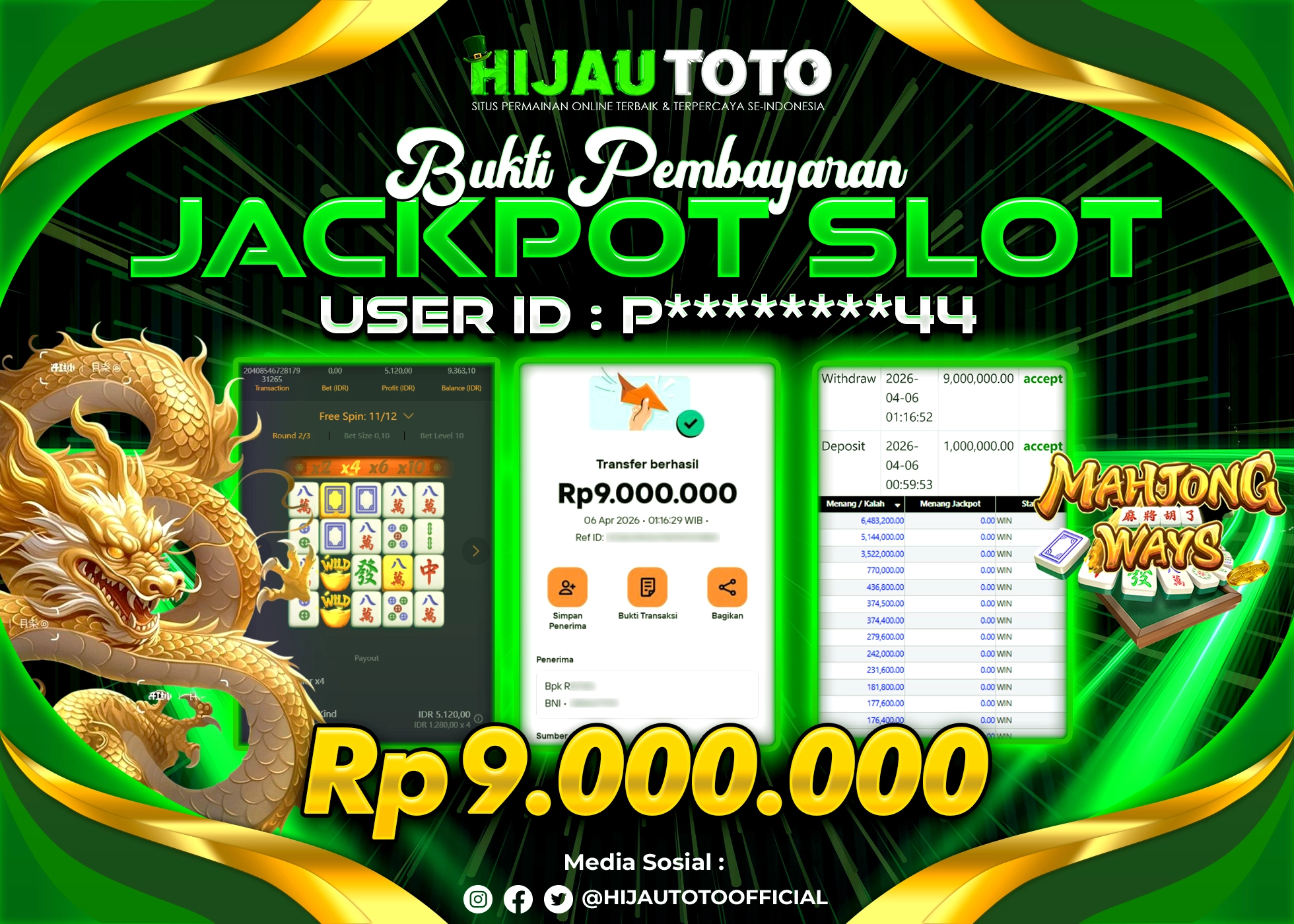 Selamat datang di HIJAUTOTO, tempatnya seru-seruan dan cuan besar! Mulai main cukup dengan modal Rp5.000 aja, taruhan super murah dari Rp100 perak! Mau main slot yang penuh warna? Atau togel dari 20 pasaran paling hits? Atau mungkin tembak ikan yang bikin deg-degan? Tenang, ada juga taruhan bola, sabung ayam, dan live casino yang bikin suasana makin hidup! Daftar sekarang dan dapetin bonus new member 100% langsung, biar modalmu makin tebal. Deposit gampang banget, bisa pakai QRIS, dan kalau butuh bantuan, customer service kita siap 24 jam nonstop. Jadi, tunggu apa lagi? Yuk, gabung dan bawa pulang kemenangannya cuma di HIJAUTOTO!