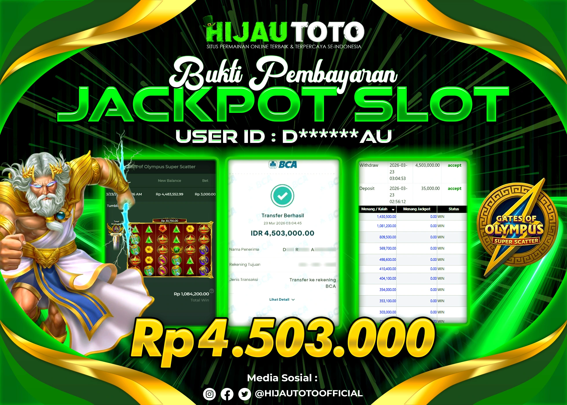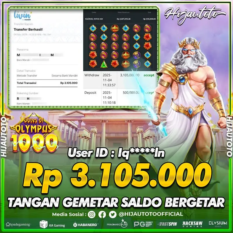 Selamat Kepada Member HIJAUTOTO IQ*****IN Telah Jackpot Di SLOT GATES OF OLYMPUS 1000