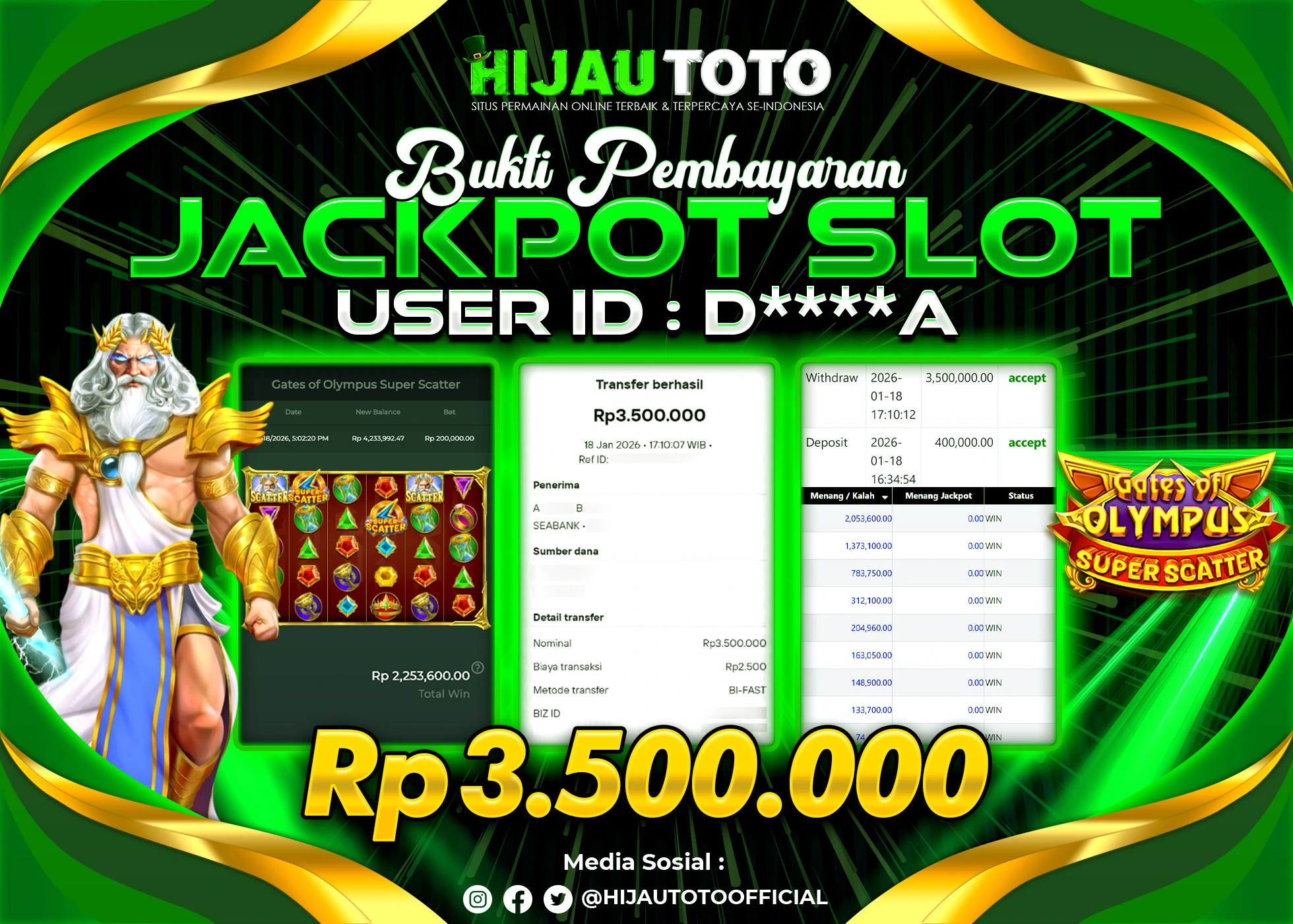 Selamat datang di HIJAUTOTO, tempatnya seru-seruan dan cuan besar! Mulai main cukup dengan modal Rp5.000 aja, taruhan super murah dari Rp100 perak! Mau main slot yang penuh warna? Atau togel dari 20 pasaran paling hits? Atau mungkin tembak ikan yang bikin deg-degan? Tenang, ada juga taruhan bola, sabung ayam, dan live casino yang bikin suasana makin hidup! Daftar sekarang dan dapetin bonus new member 100% langsung, biar modalmu makin tebal. Deposit gampang banget, bisa pakai QRIS, dan kalau butuh bantuan, customer service kita siap 24 jam nonstop. Jadi, tunggu apa lagi? Yuk, gabung dan bawa pulang kemenangannya cuma di HIJAUTOTO!