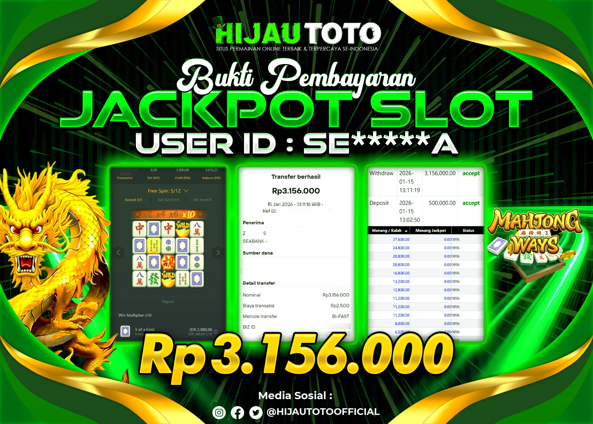 Selamat Kepada Member HIJAUTOTO N*******00 Telah Jackpot Di SLOT MAHJONG WAYS