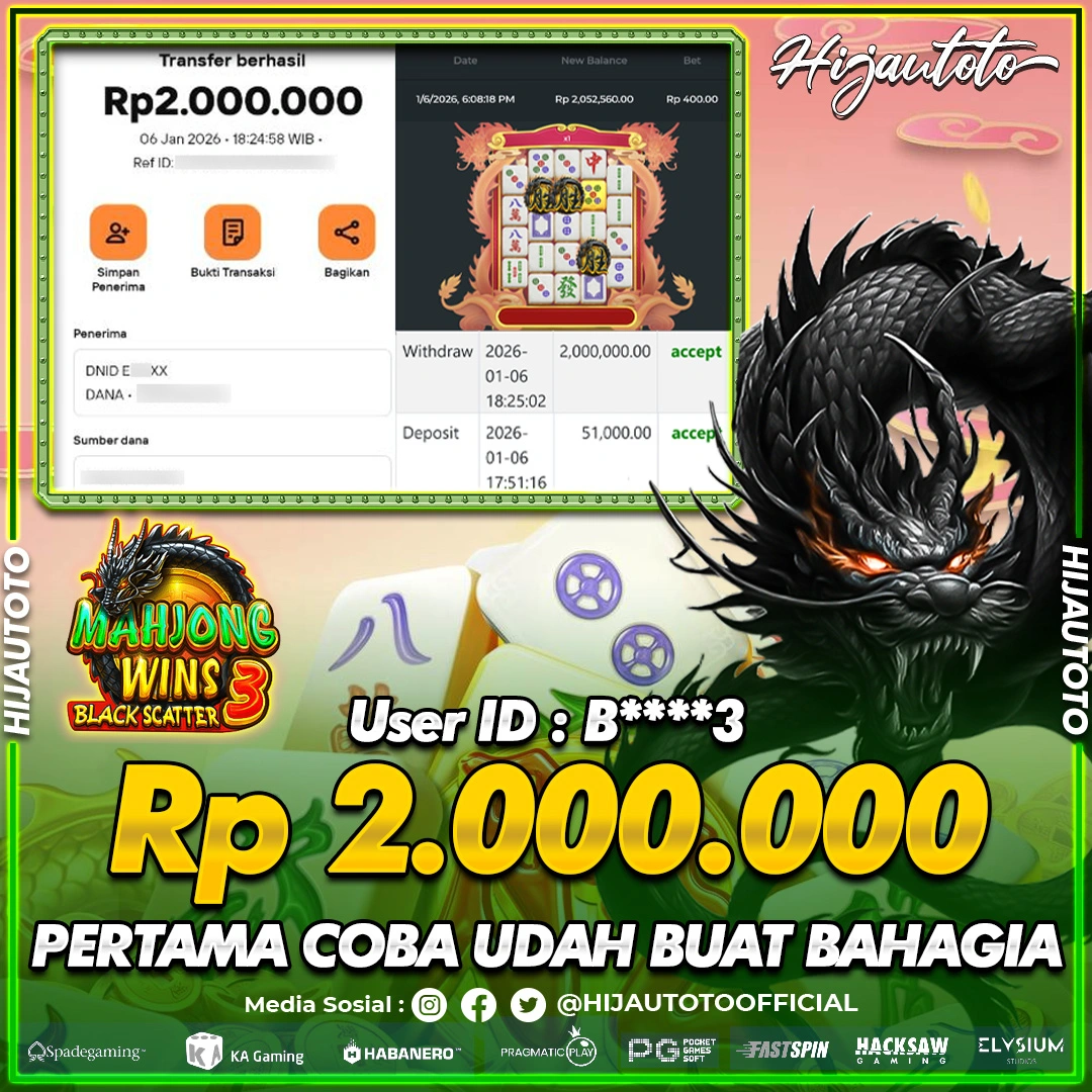Selamat Kepada Member HIJAUTOTO B****3 Telah Jackpot Di SLOT MAHJONG WINS 3 BLACK SCATTER