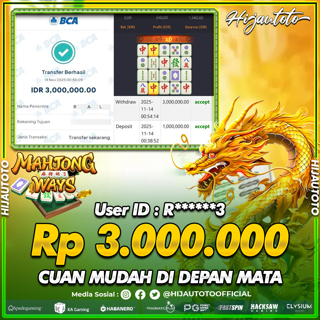 Selamat Kepada Member HIJAUTOTO A****A Telah Jackpot Di SLOT MAHJONG WAYS