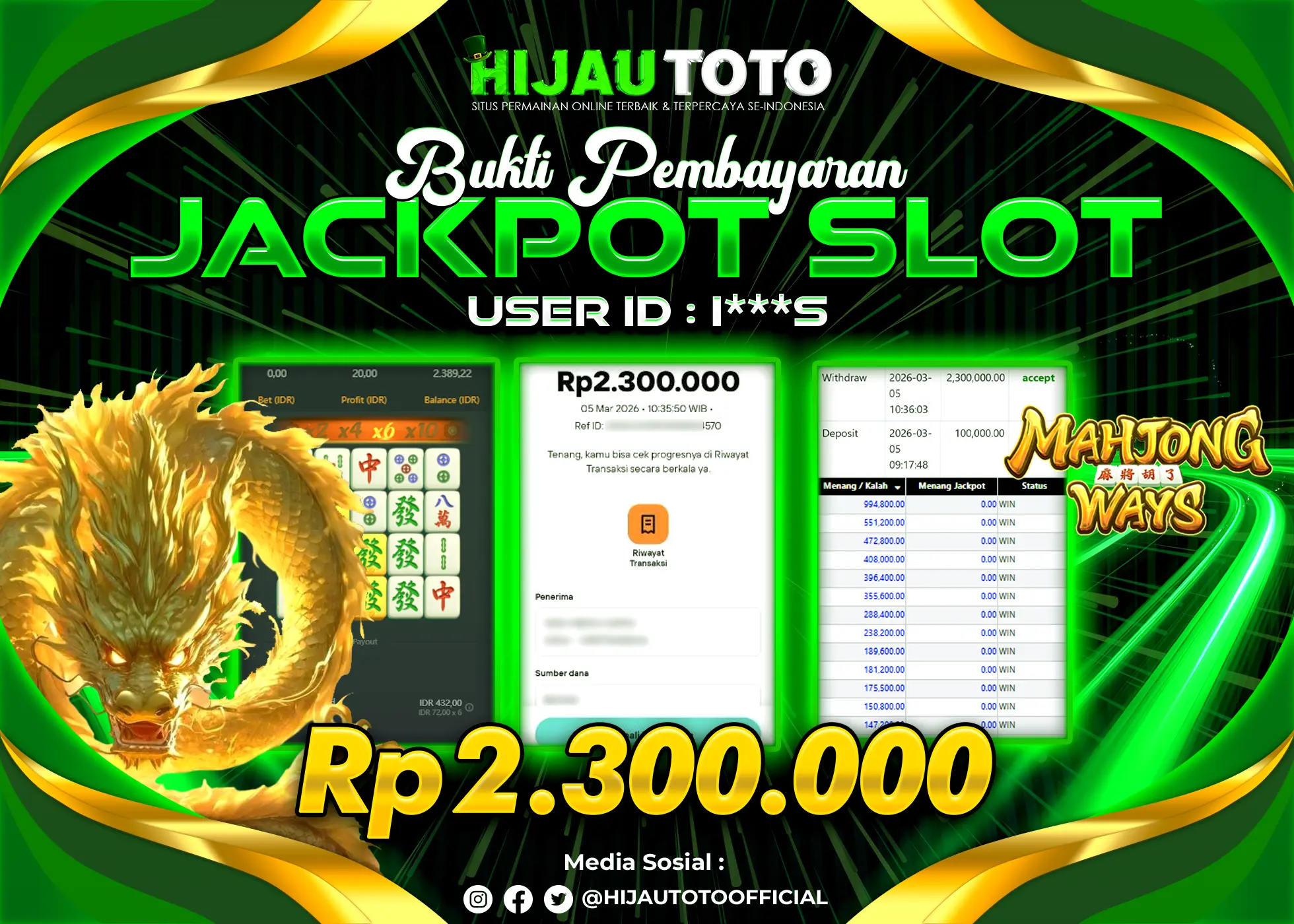 Selamat Kepada Member HIJAUTOTO I**** Telah Jackpot Di SLOT MAHJONG WAYS