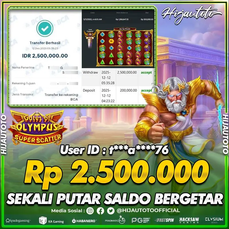 Selamat Kepada Member HIJAUTOTO T***A****76 Telah Jackpot Di SLOT GATES OF OLYMPUS SUPER SCATTER