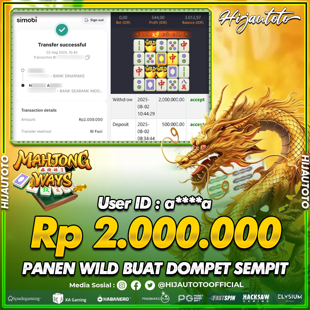 Karena berhasil memenangkan Rp.Rp.2.408.850 dari permainan seru SLOT MAHJONG WAYS di HIJAUTOTO! πŸ’°πŸ’Έ