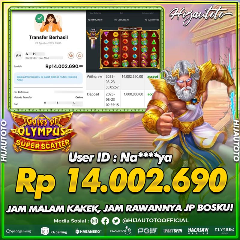Selamat Kepada Member HIJAUTOTO NA****YA Telah Jackpot Di SLOT GATES OF OLYMPUS SUPER SCATTER