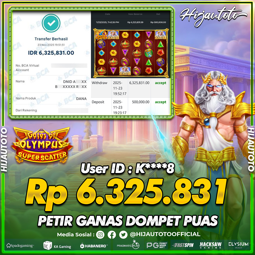Selamat Kepada Member HIJAUTOTO K****8 Telah Jackpot Di SLOT GATES OF 0LYMPUS SUPER SCATTER