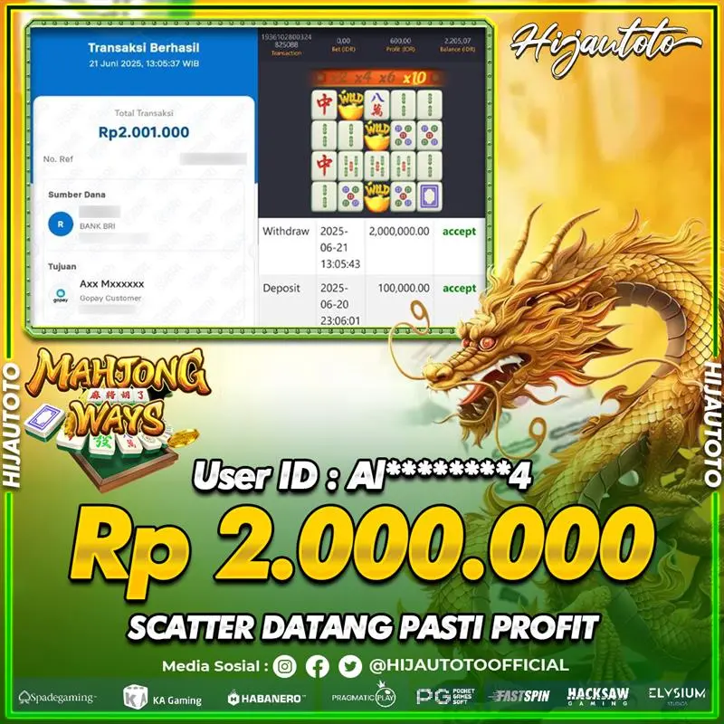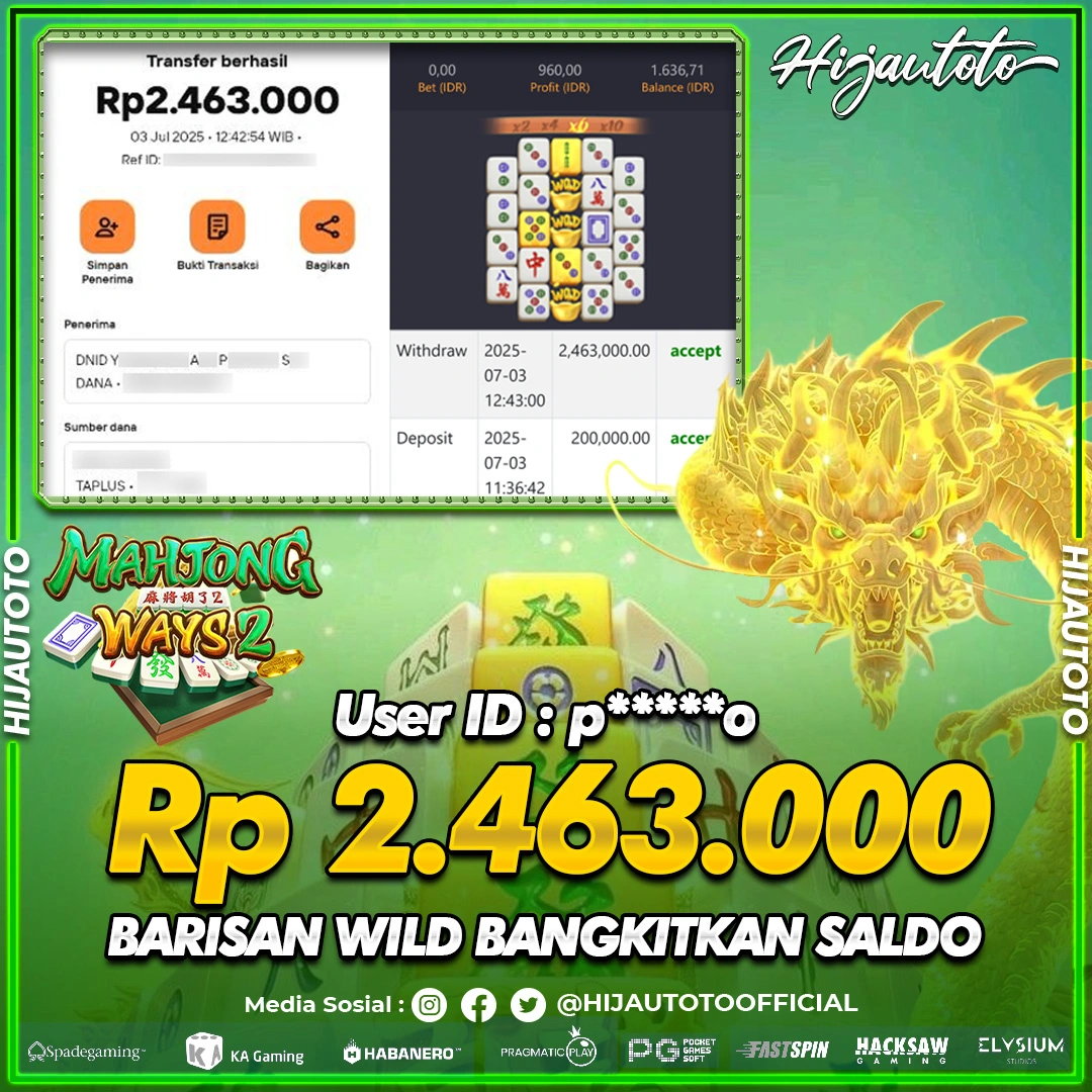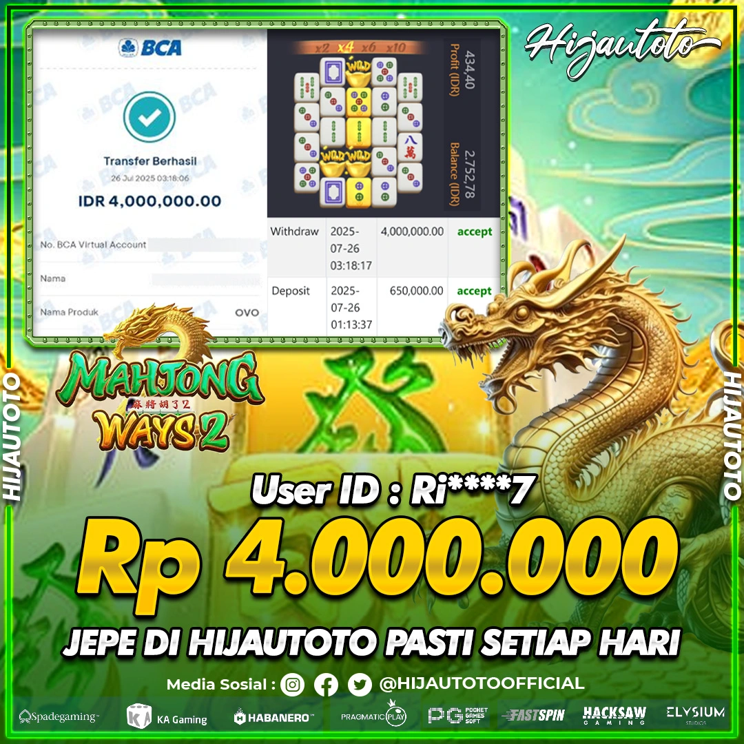 Selamat Kepada Member HIJAUTOTO RI****7 Telah Jackpot Di SLOT MAHJONG WAYS 2