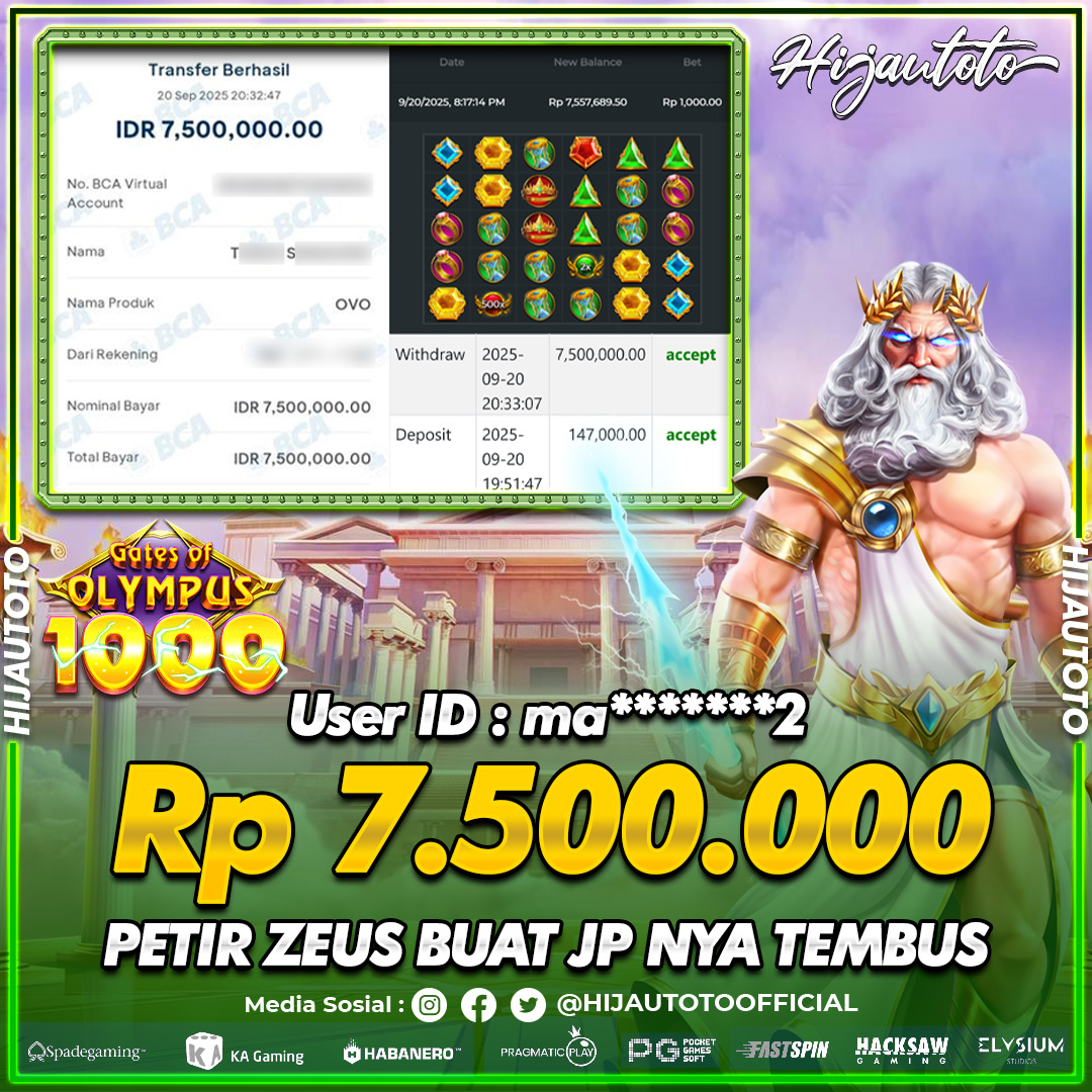Selamat Kepada Member HIJAUTOTO MA*******2 Telah Jackpot Di SLOT GATES OF 0LYMPUS 1000