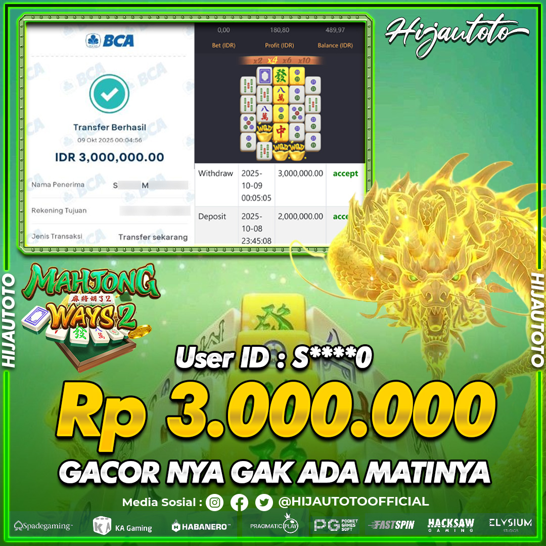 Selamat Kepada Member HIJAUTOTO S****0 Telah Jackpot Di SLOT MAHJONG WAYS 2