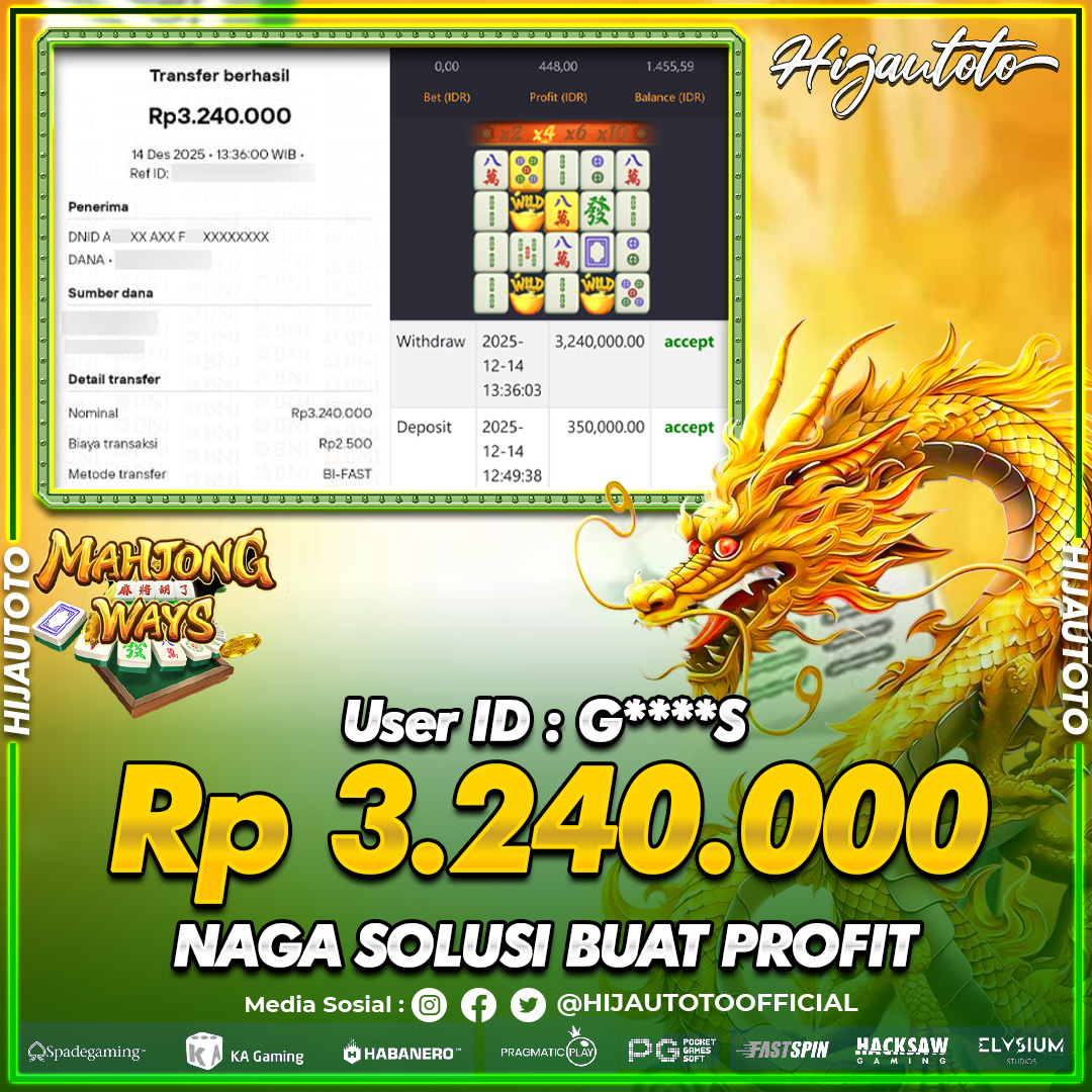 Selamat Kepada Member HIJAUTOTO G****S Telah Jackpot Di SLOT MAHJONG WAYS