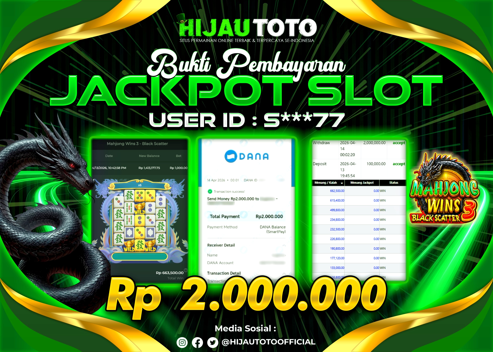 Selamat Kepada Member HIJAUTOTO S**** Telah Jackpot Di SLOT MAHJONG WINS 3 BLACK SCATTER