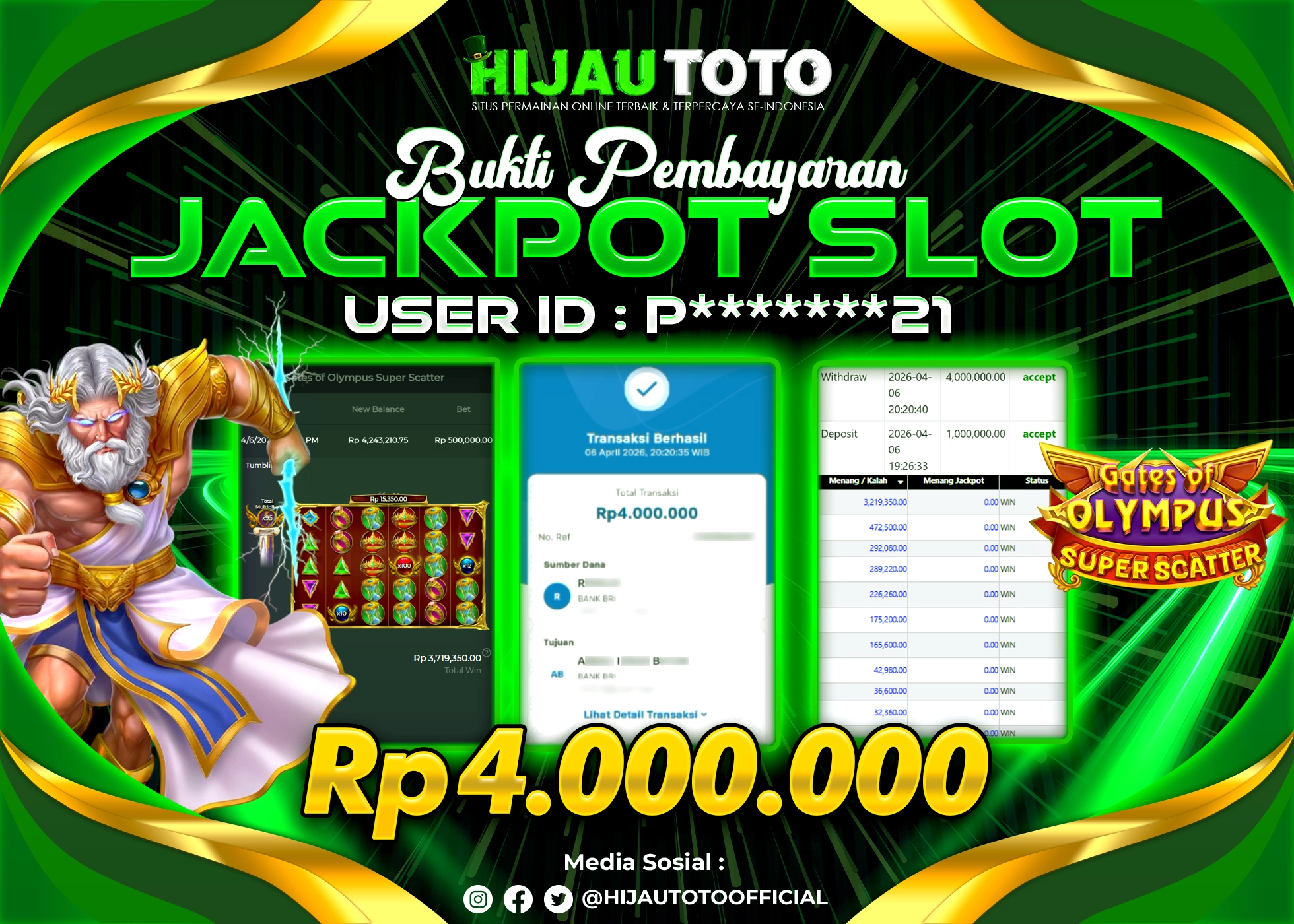 Cuma di HIJAUTOTO, tempat paling AMAN, CEPAT, & TERPERCAYA buat pecinta game SLOT GATES OF OLYMPUS SUPER SCATTER!