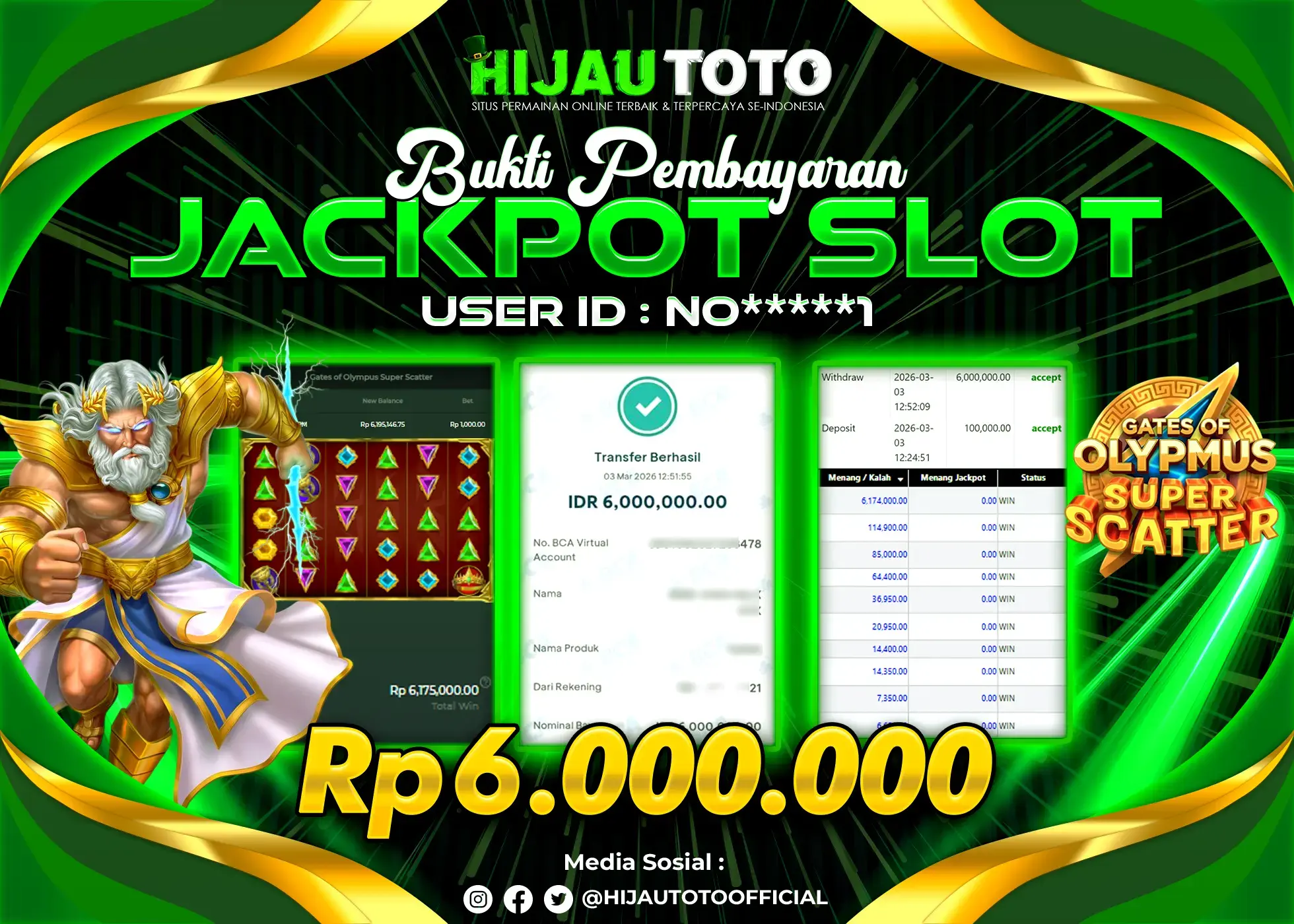 Selamat Kepada Member HIJAUTOTO NO*****1 Telah Jackpot Di SLOT GATES OF OLYMPUS SUPER SCATTER