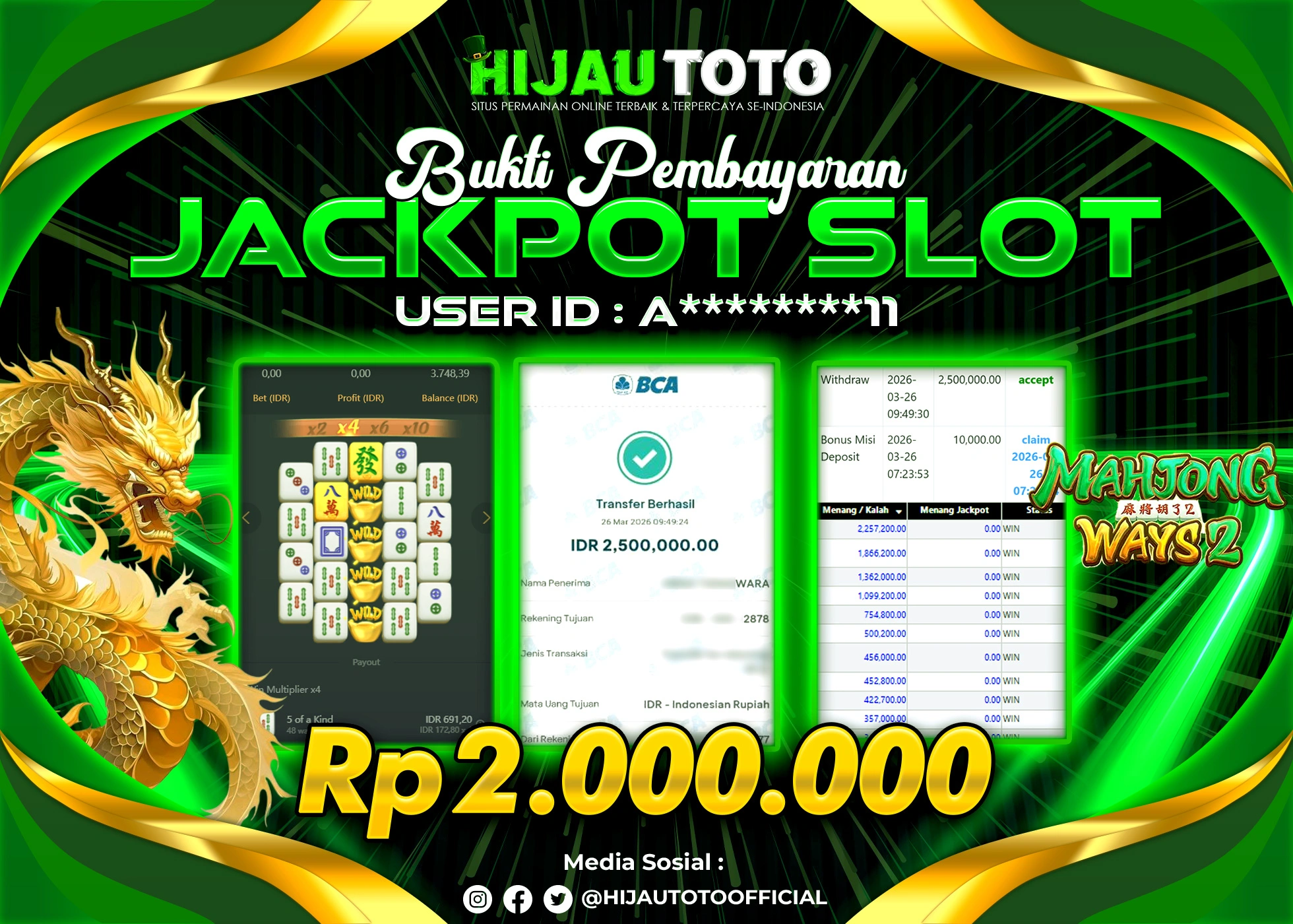 Selamat Kepada Member HIJAUTOTO A********11 Telah Jackpot Di SLOT MAHJONG WAYS 2