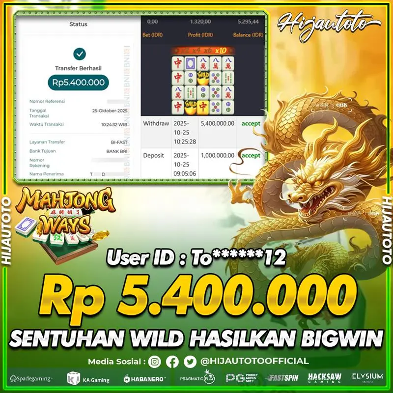 Selamat Kepada Member HIJAUTOTO TO******12 Telah Jackpot Di SLOT MAHJONG WAYS