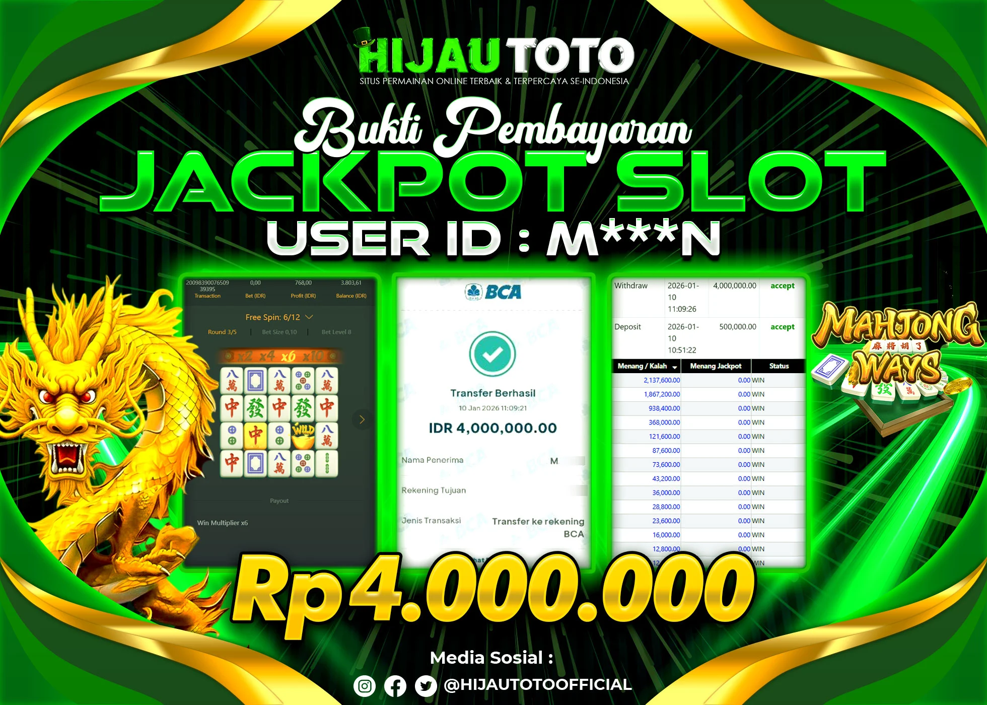 Bergabung dengan HIJAUTOTO sangat mudah dan cepat. Cukup lakukan pendaftaran dengan data lengkap, lakukan deposit minimal Rp5.000 melalui berbagai metode termasuk QRIS, dan mulai bertaruh dengan minimal taruhan Rp100. Dapatkan juga bonus new member 100% untuk modal bermain lebih besar.