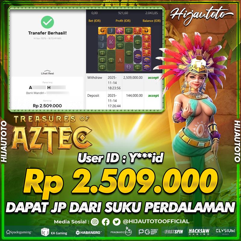 Selamat Kepada Member HIJAUTOTO Y****D Telah Jackpot Di SLOT TREASURES OF AZTEC