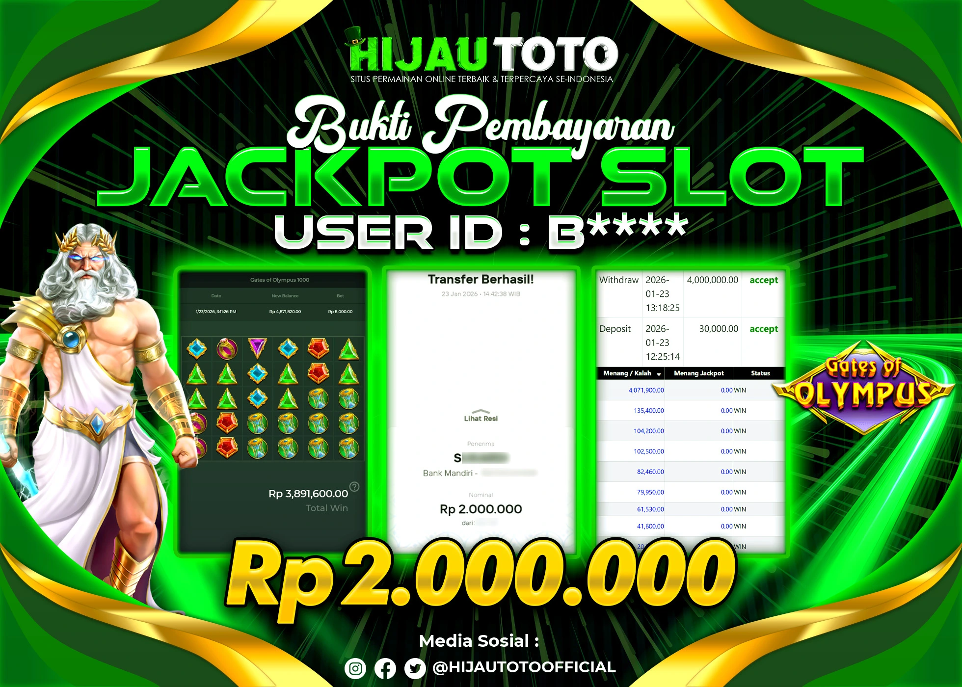 Selamat datang di HIJAUTOTO, tempatnya seru-seruan dan cuan besar! Mulai main cukup dengan modal Rp5.000 aja, taruhan super murah dari Rp100 perak! Mau main slot yang penuh warna? Atau togel dari 20 pasaran paling hits? Atau mungkin tembak ikan yang bikin deg-degan? Tenang, ada juga taruhan bola, sabung ayam, dan live casino yang bikin suasana makin hidup! Daftar sekarang dan dapetin bonus new member 100% langsung, biar modalmu makin tebal. Deposit gampang banget, bisa pakai QRIS, dan kalau butuh bantuan, customer service kita siap 24 jam nonstop. Jadi, tunggu apa lagi? Yuk, gabung dan bawa pulang kemenangannya cuma di HIJAUTOTO!